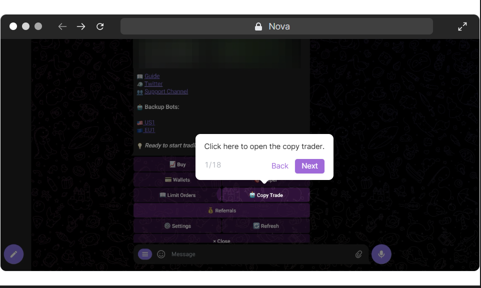 To access the copy trading module, select the Copy Trade button from the main menu or type /copytrade.