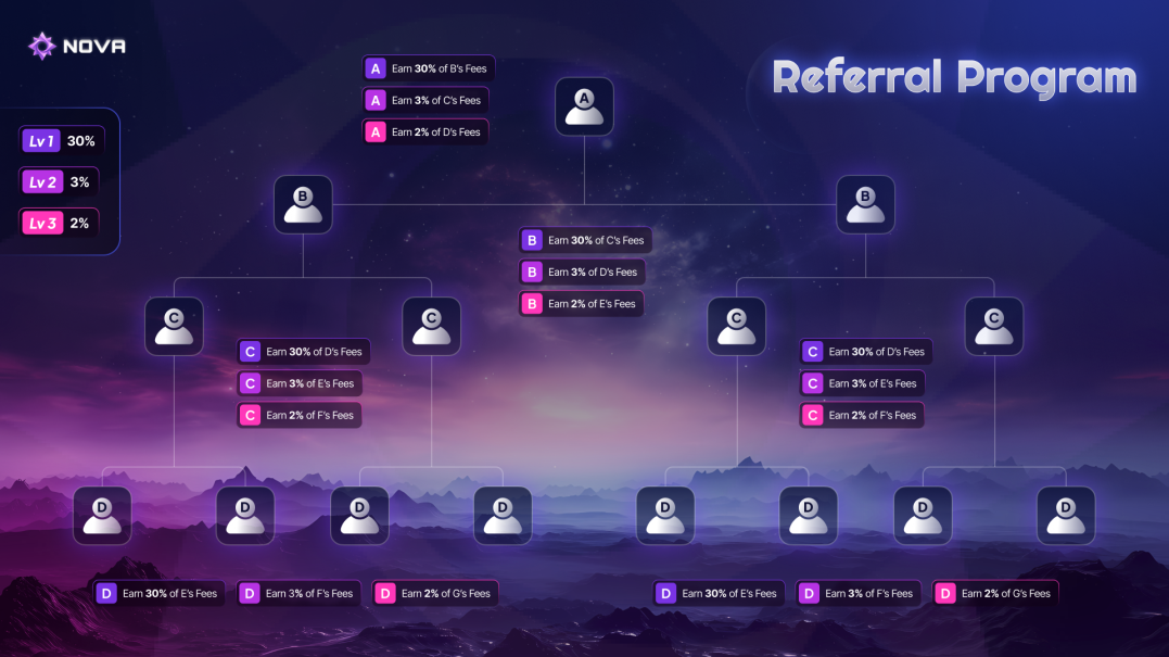 Nova's generous referral structure means that even with just a handful of direct referrals, you can earn from the trading activity of multiple users at different tiers.