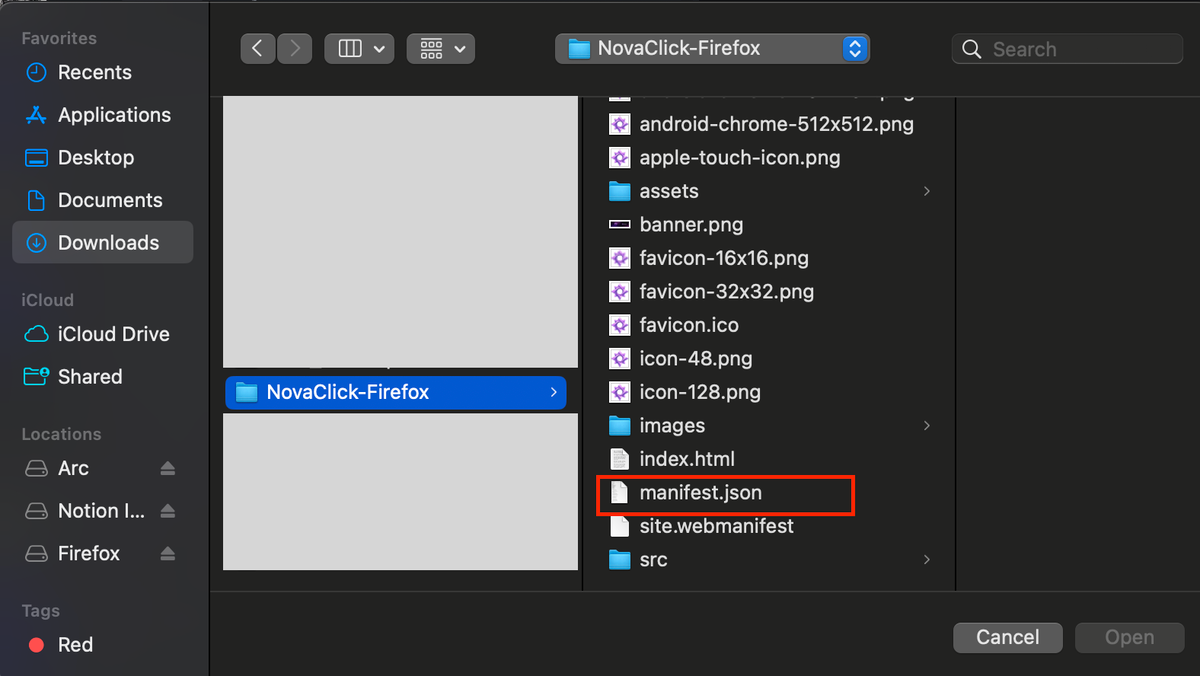 Make sure to navigate to the extracted Nova Click folder once pop-up is initiated, and inside of the folder find **manifest.json, which you will need to select.**