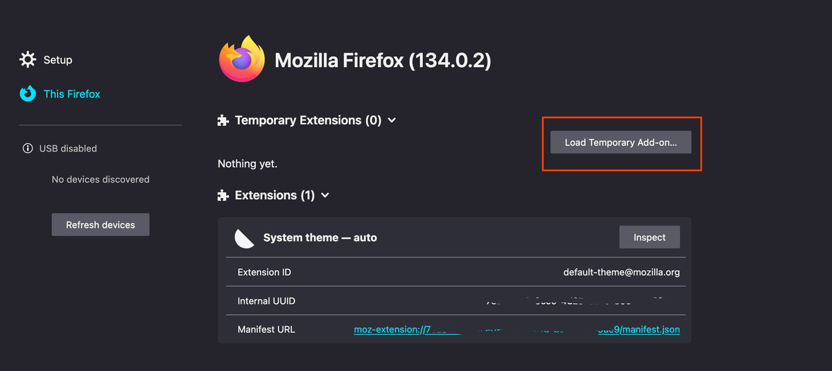 On the right hand-side of the This Firefox Page, press the **Load Temporary Add-On** button